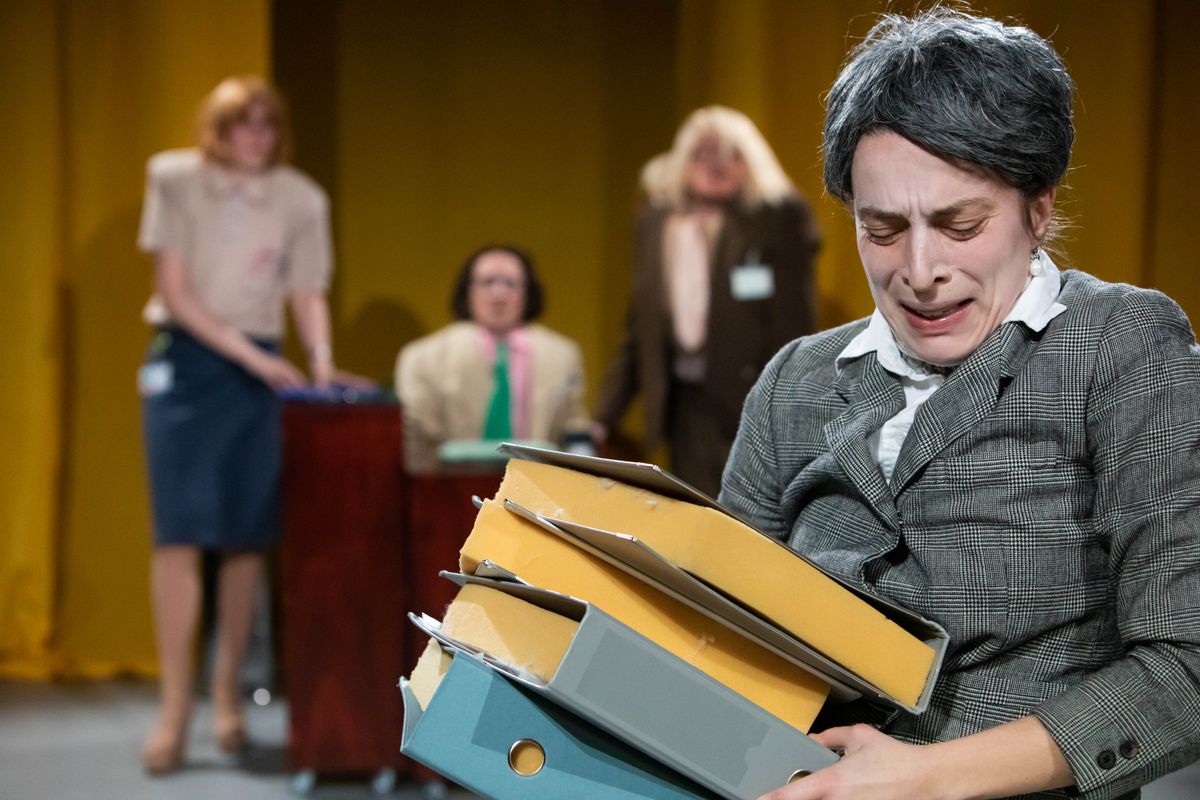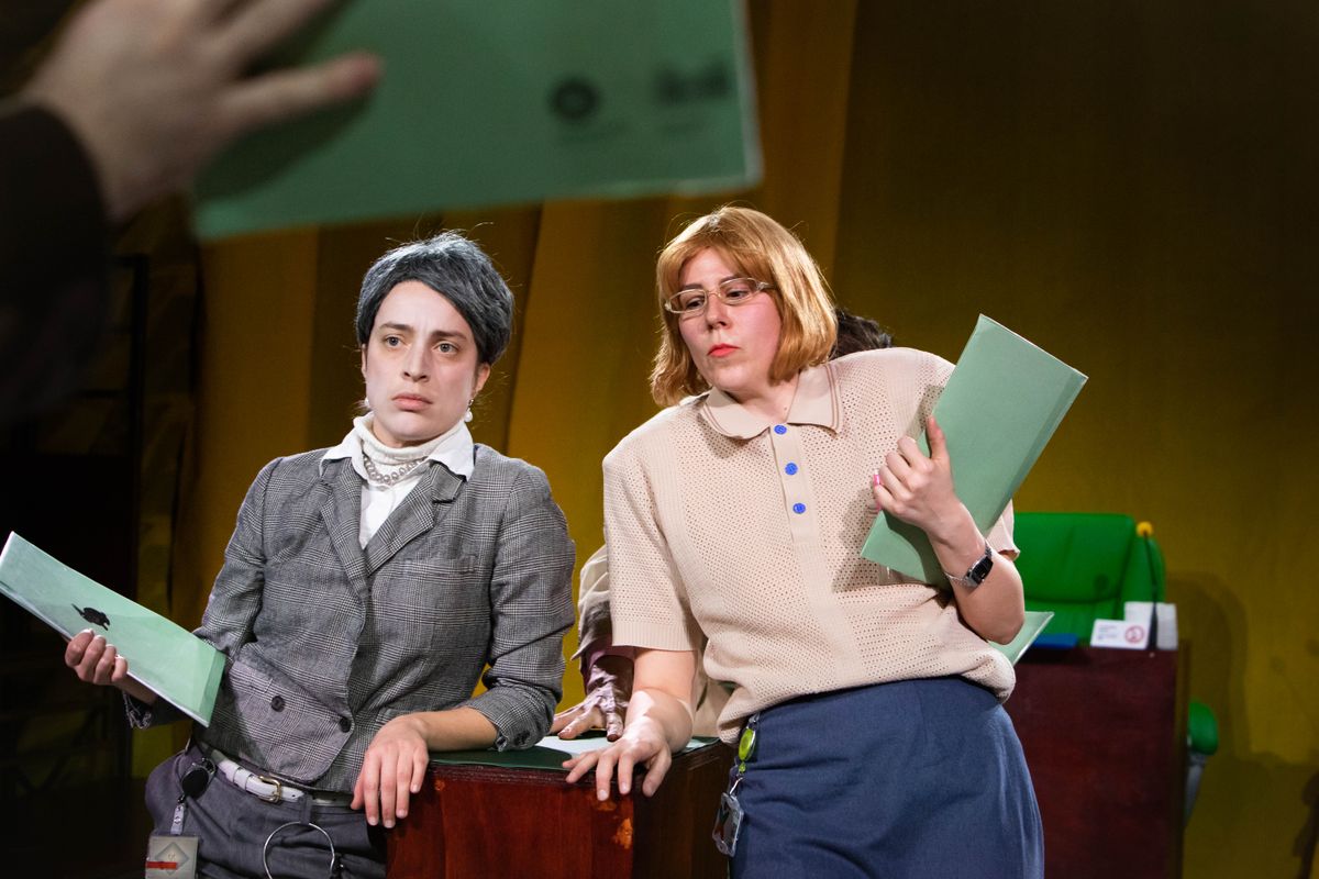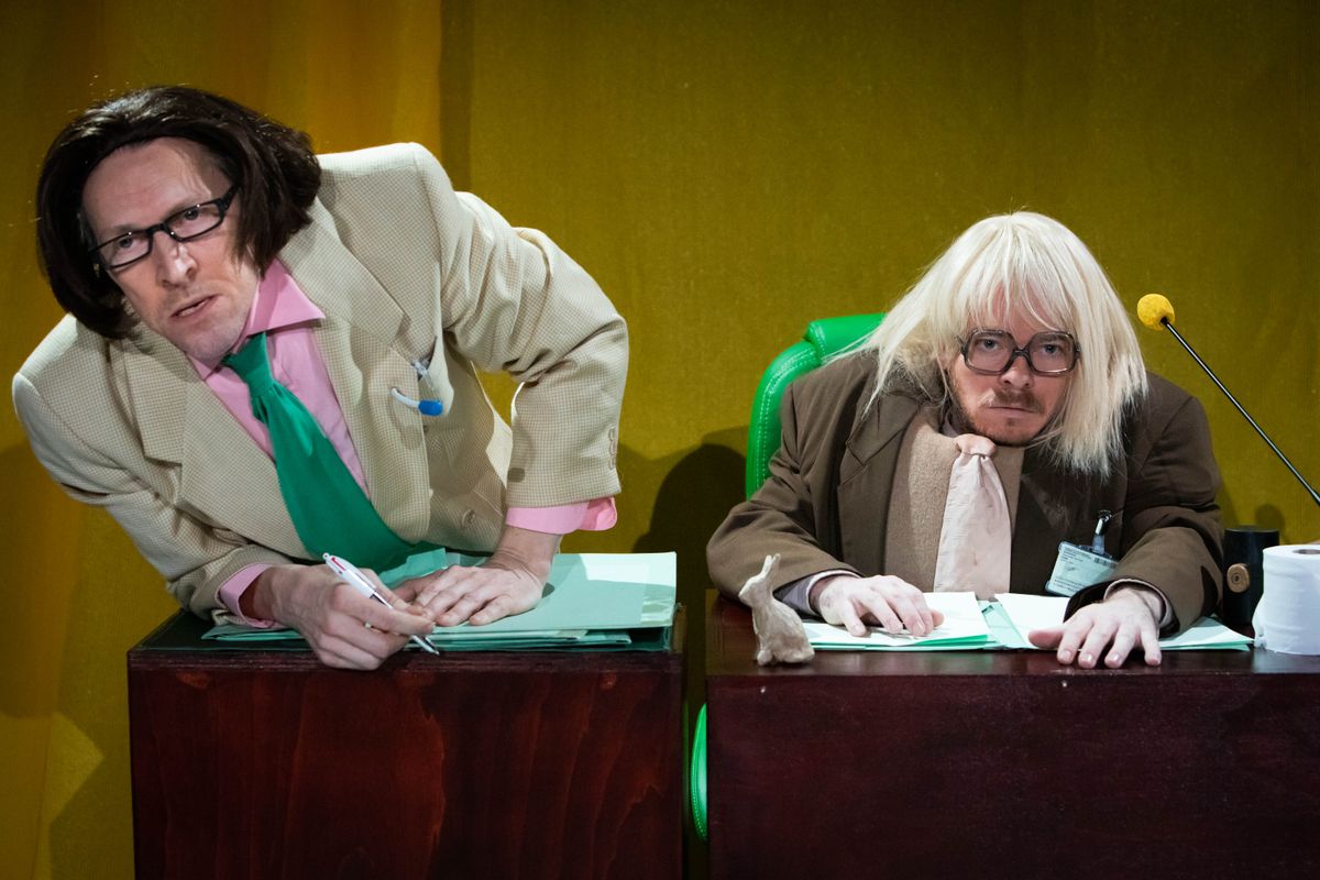 Het publiek is op twee tribunes tegenover elkaar getuige van een georganiseerde chaos en lacht zich een kriek om zoveel inefficiëntie en tragiek.