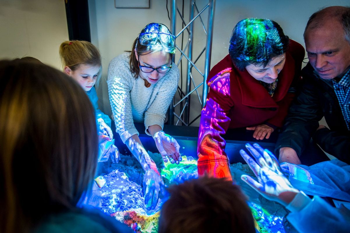 In onze Augmented Reality Zandbak zie je de topografische kaart van jouw landschap verschijnen terwijl je zelf bergen en kraters maakt. Je kan het zelfs virtueel laten regenen en zien hoe het water doorheen je landschap vloeit.