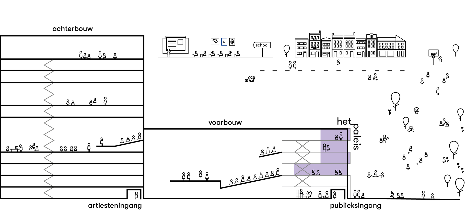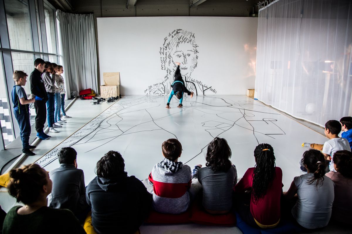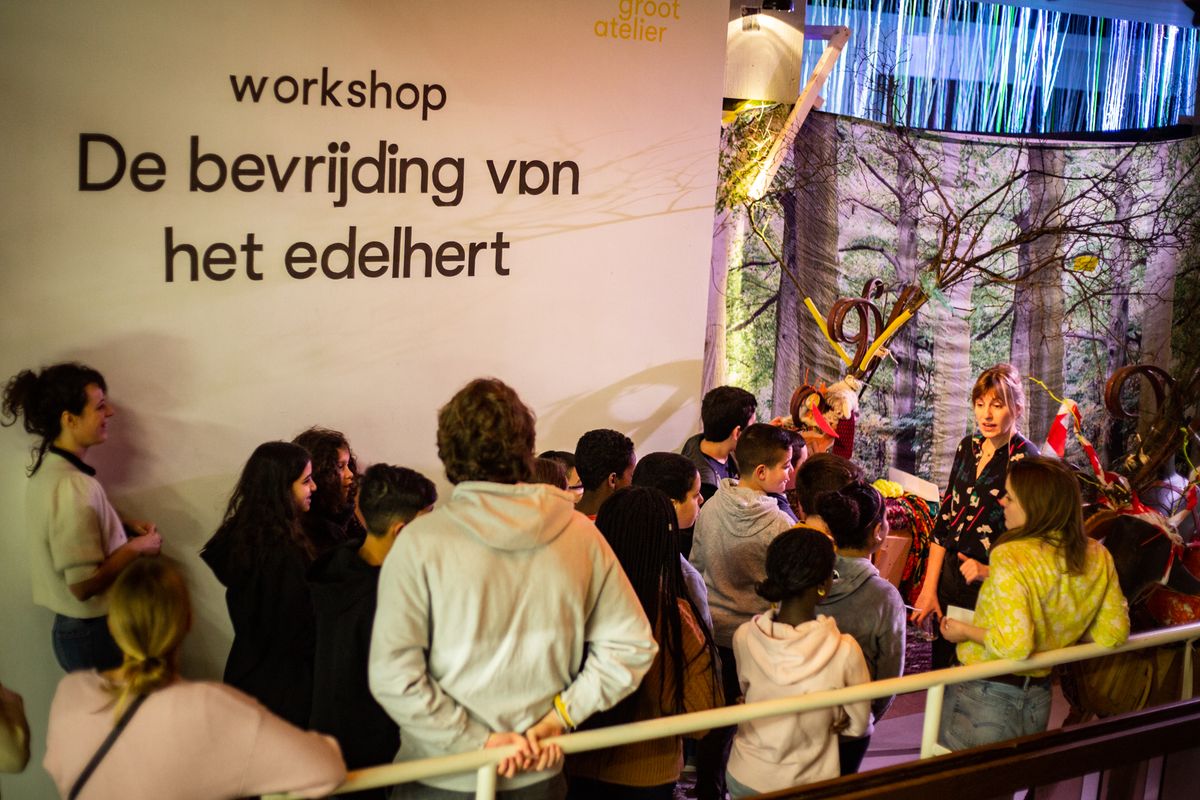 Vier atelierruimtes, met uitzicht op het plein. Wekelijks zijn hier honderden kinderen te gast. Ze werken samen met artiesten en worden ondergedompeld in de wereld van het theater. Voor velen is het een eerste, unieke ervaring, de basis van een lang artistiek traject.