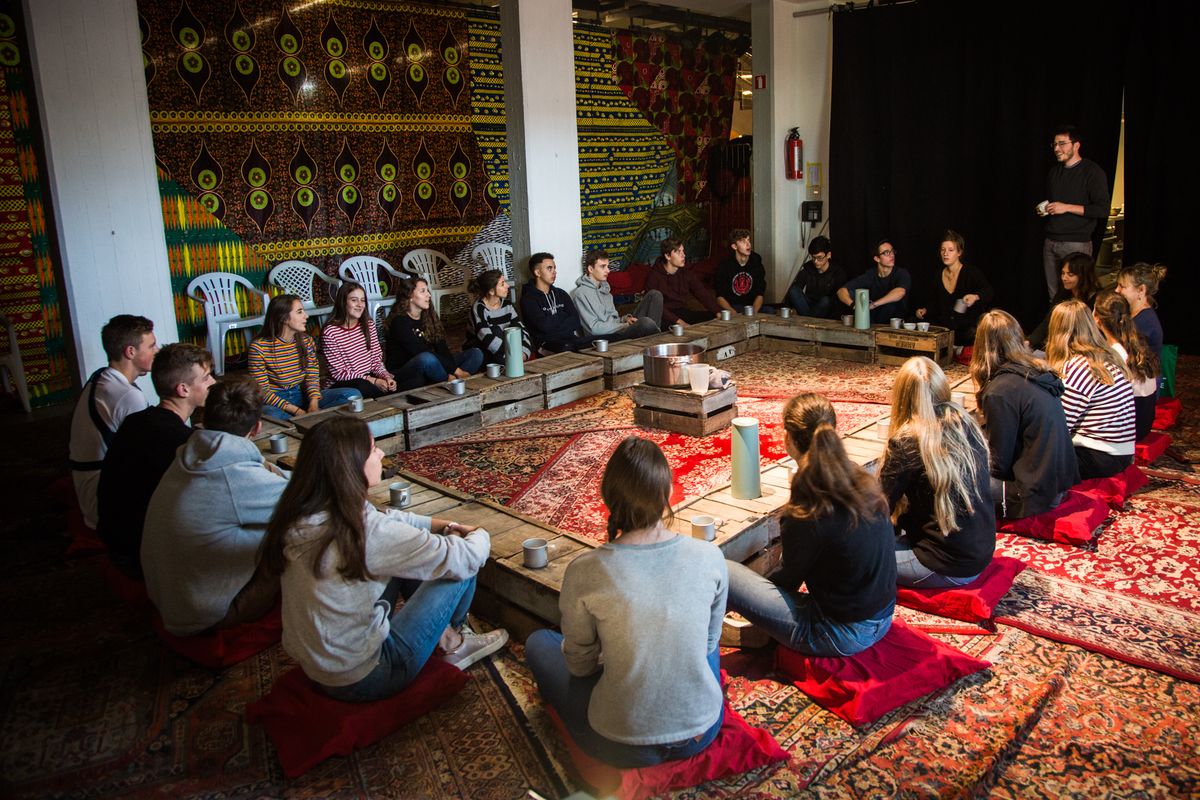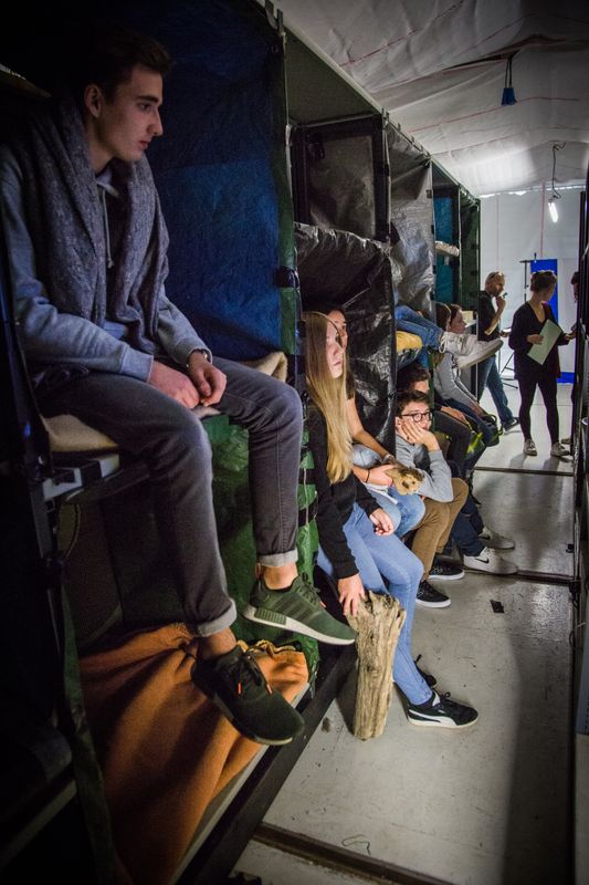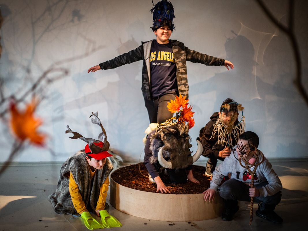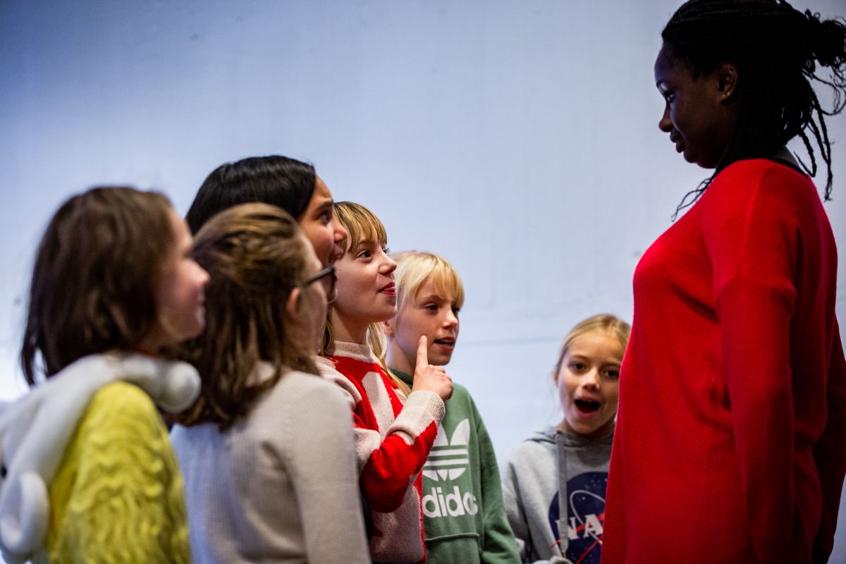 Vier atelierruimtes, met uitzicht op het plein. Wekelijks zijn hier honderden kinderen te gast. Ze werken samen met artiesten en worden ondergedompeld in de wereld van het theater. Voor velen is het een eerste, unieke ervaring, de basis van een lang artistiek traject.