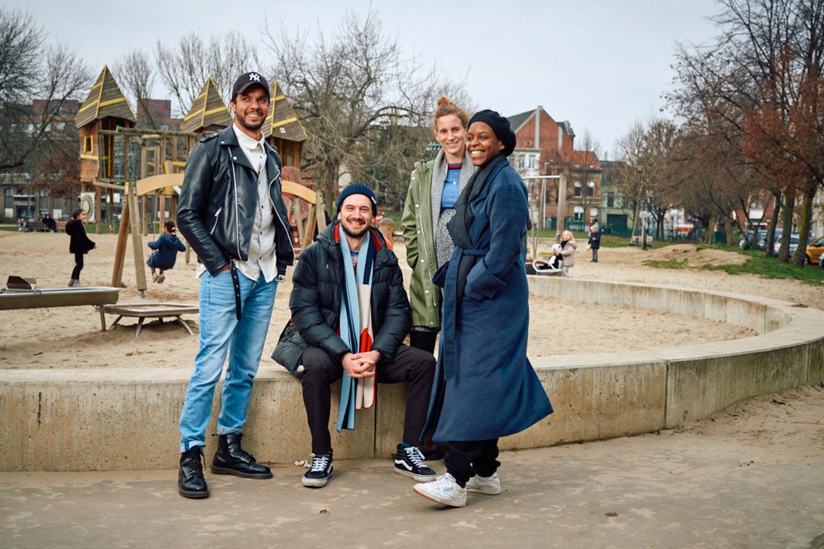 Vier theatermakers - Khalid Koujili El Yakoubi, Michai Geyzen, Suzanne Grotenhuis en Dalilla Hermans – ontmoeten elkaar op het Krugerplein in Borgerhout.