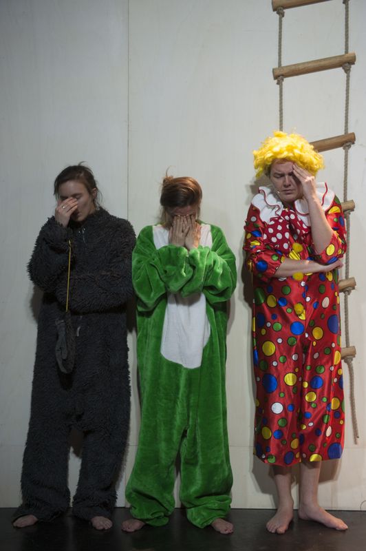 Aan de ene kant zitten de volwassenen te kijken naar een 18+ voorstelling over kinderen. En aan de andere kant zitten de kinderen te kijken naar een 8+ voorstelling over volwassenen. Niemand weet wat er aan de