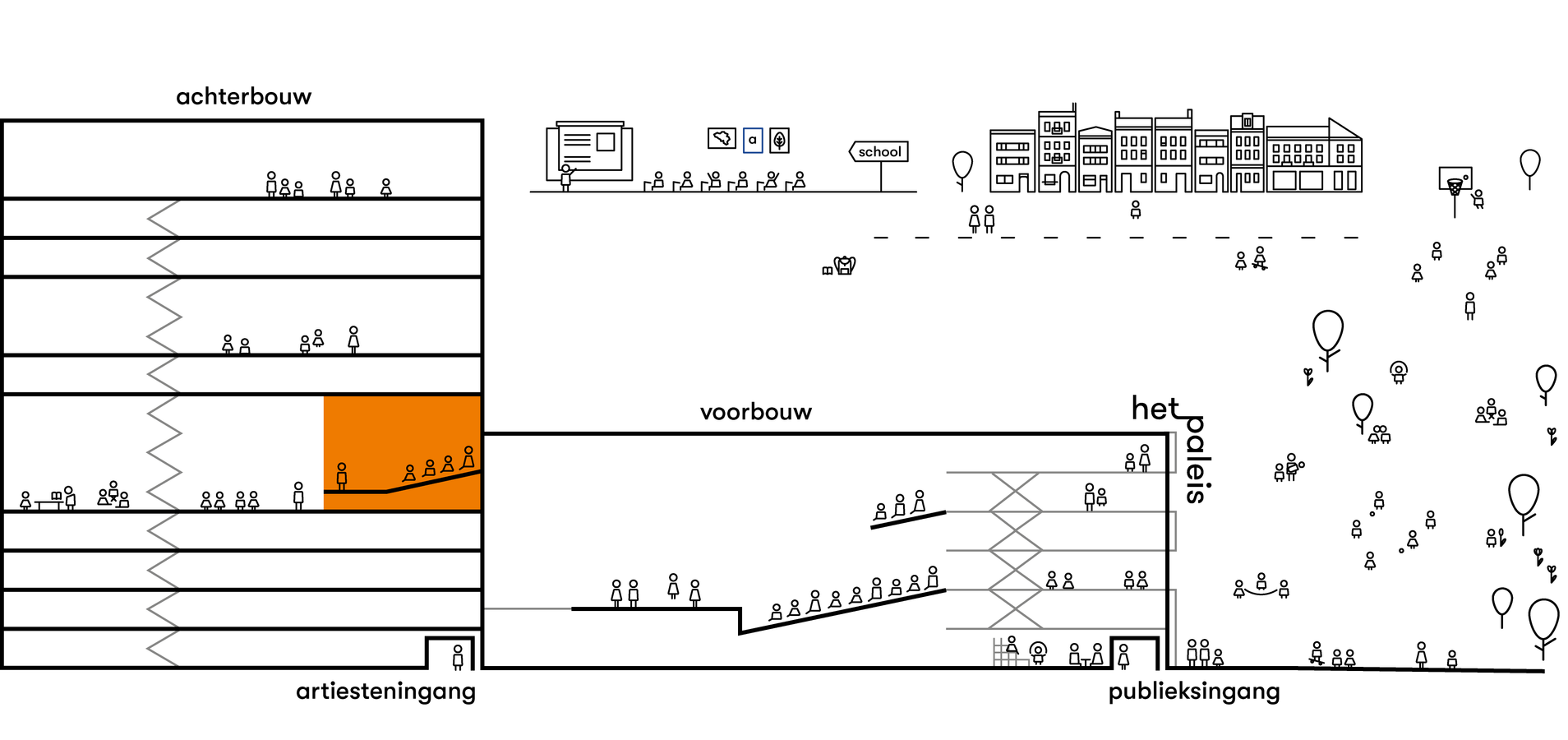 Een zaal met een vlakke vloer en een inschuifbare tribune van 116 plaatsen. De uitgelezen plek voor voorstellingen vanaf de kleuterleeftijd, voor intimistisch werk, voor ontwikkeling en experiment.