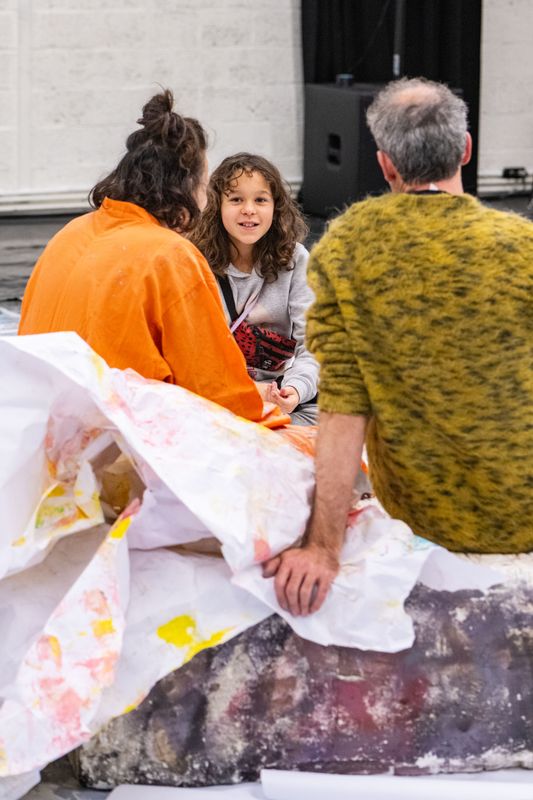 Maarten: Op dat reusachtige schilderij komen dan grote stroken papier waarop de jonge dansers met wasco gaan tekenen.